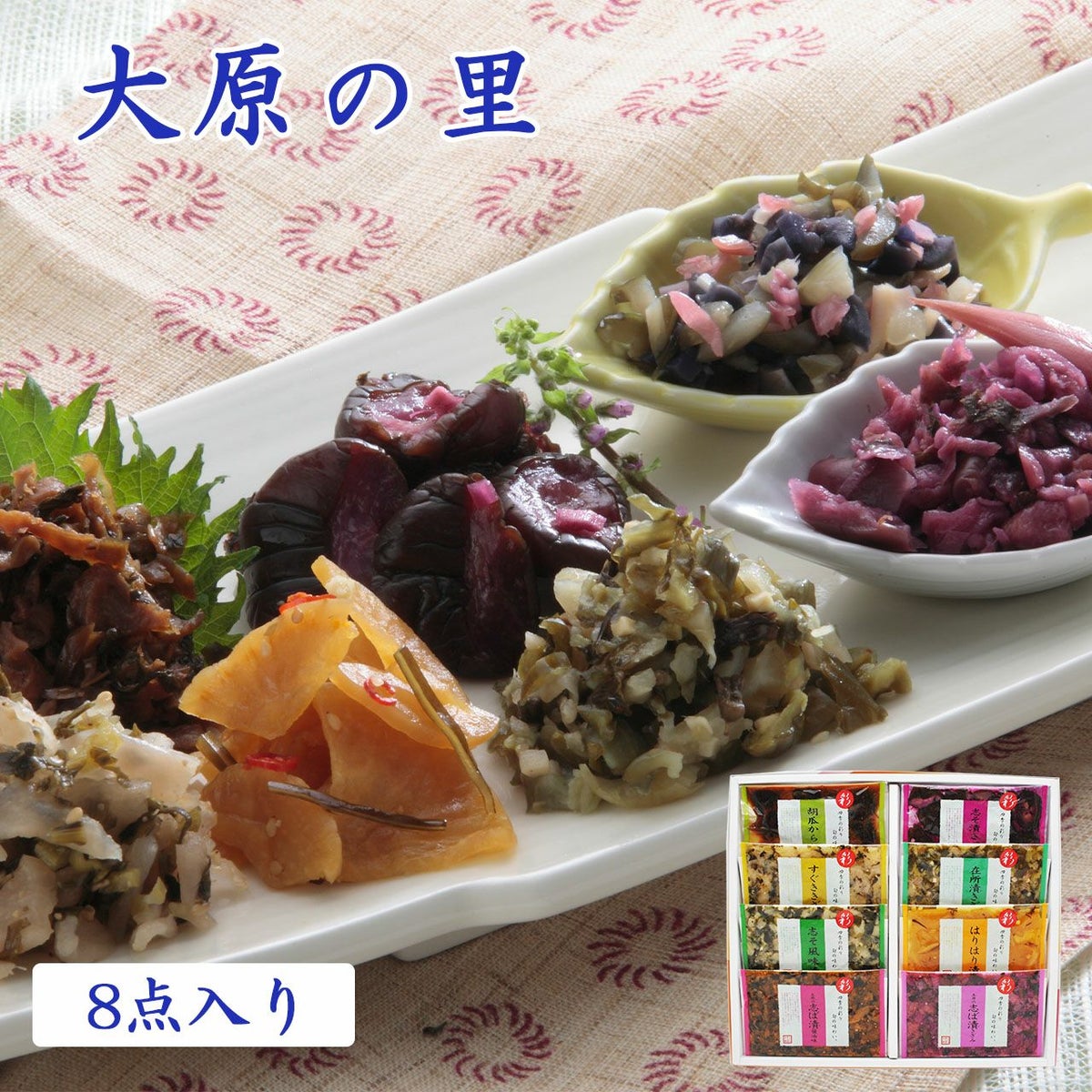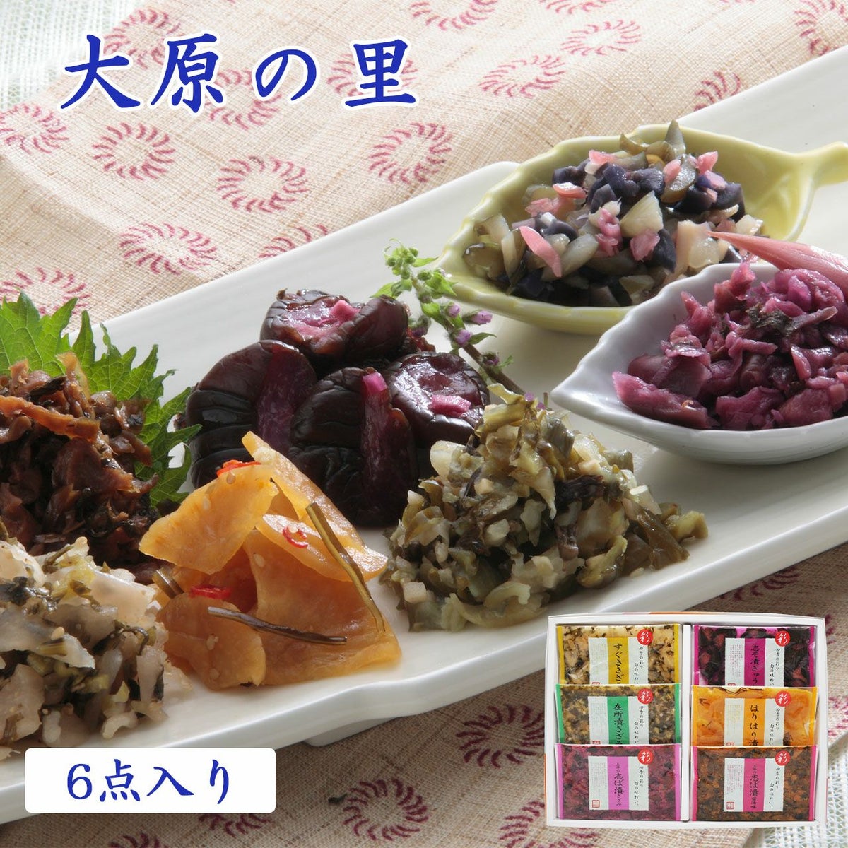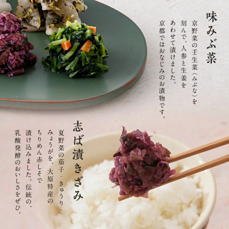 いろとりどりな京つけものと、大原伝統の志ば漬。 風味豊なおいしさをお楽しみください。
