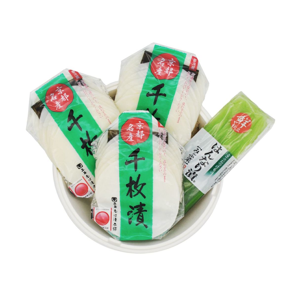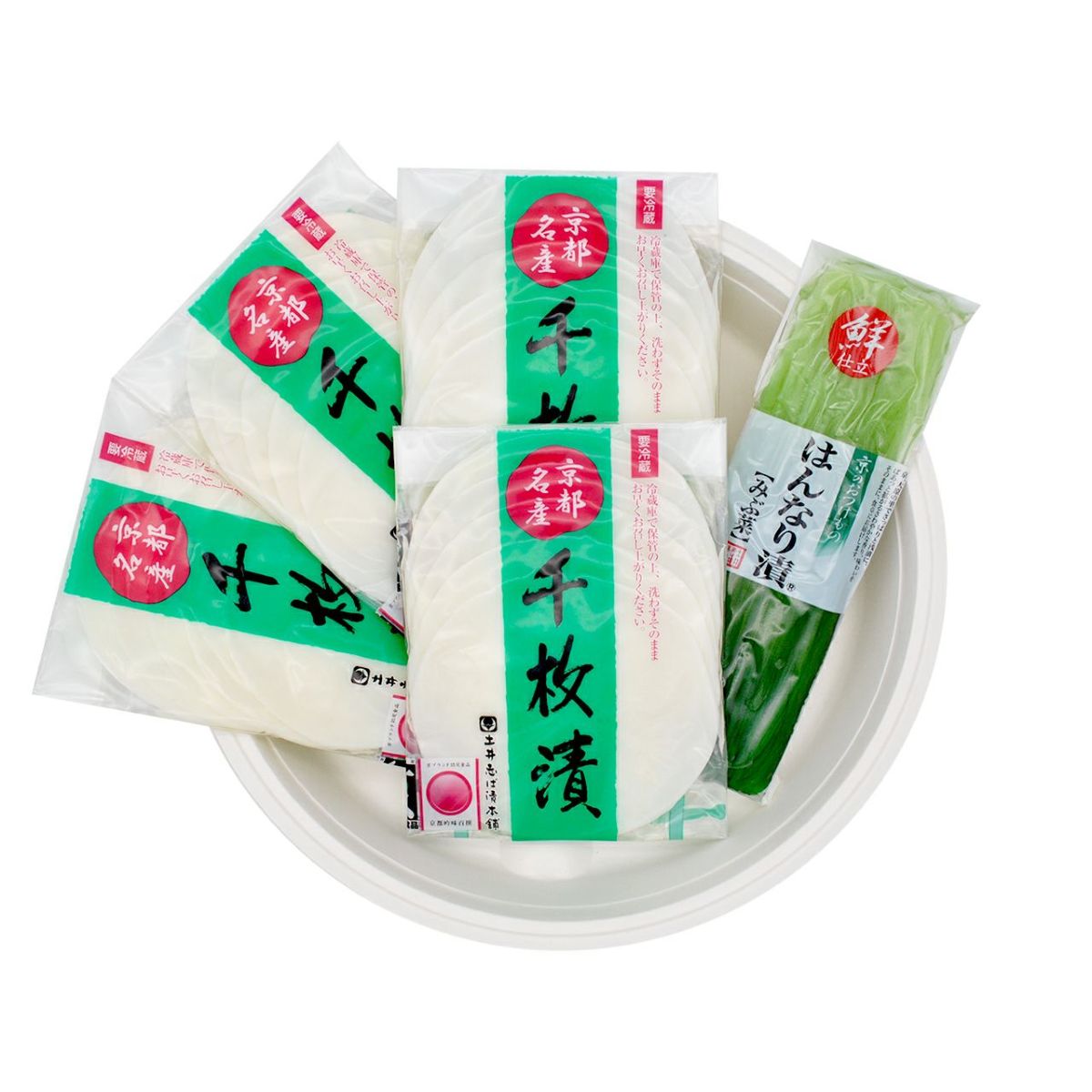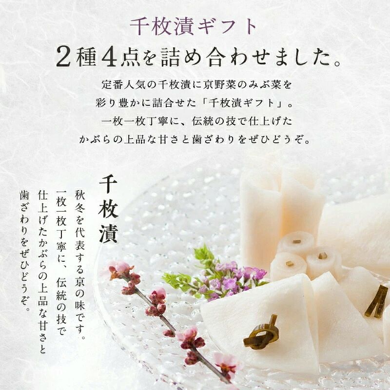 定番人気の千枚漬に京野菜のみぶ菜を彩り豊かに詰合せた「千枚漬ギフト」。