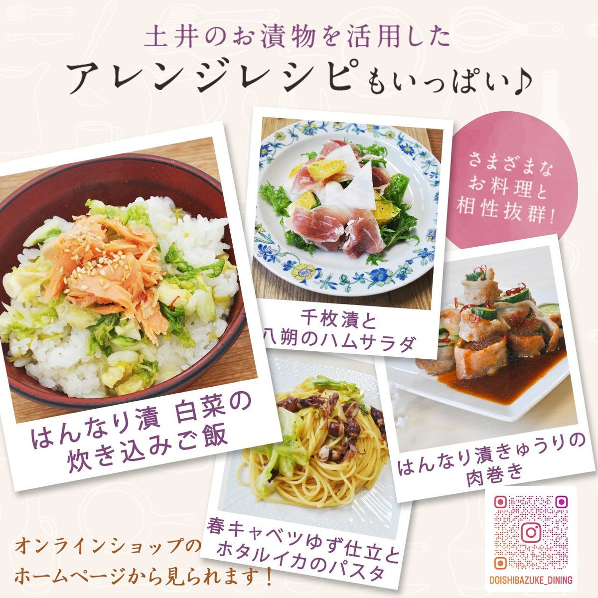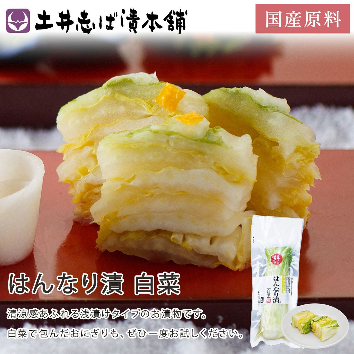 清涼感あふれる浅漬けタイプのお漬物です。白菜で包んだおにぎりも、ぜひ一度お試しください。じわっとした旨みがごはんを包み込みます。おいしいですよ!